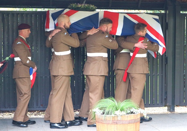 His coffin, draped in the Union flag, was carried into the Waterside Chapel by six Paras, and followed by regimental Lieutenant Colonel Liam Cradden.